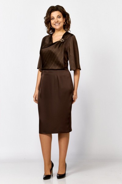 Женское платье полуприлегающего силуэта, выполнено из однотонного атласа и атласа в полоску. Лиф платья двойной и отрезной по линии талии, горловина нижнего слоя лифа округлой формы, второй слой лифа на полочке выполнен из атласа в полоску и по горловине задрапирован на эффектную пряжку. Юбка платья заужена к низу, с вытачками, выполнена из однотонного атласа. Спинка платья из однотонного атласа, со средним швом и вытачками, в среднем шве потайная молния, по низу разрез. Рукав укороченный, втачной, из атласа в полоску. Элегантное платье из приятной на ощупь ткани, с эффектным декором отличный выбор для любого мероприятия.
