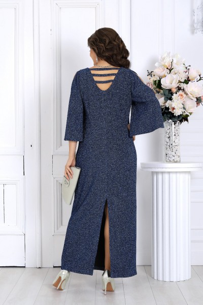 Платье женское полуприлегающего силуэта, выполнено из трикотажного полотна с фактурной лицевой стороной «люрекс». Модель на трикотажной подкладке, без застежки и плечевых накладок. Перед платья с нагрудными вытачками, направленными от проймы. Спинка с талиевыми вытачками и разрезом в нижней части среднего шва. Края V-образной горловины спинки фиксируются тремя перемычками из основного материала; горловина переда круглой формы. Рукав трехчетвертной, расширенный, с вырезом «капля» от плеча. Длина платья -- 144 см; длина рукава - 49 см.