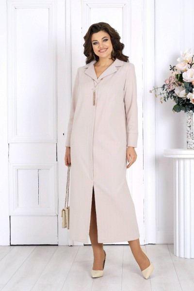 Платье женское прямого силуэта, выполнено из трикотажного полотна «елочка». Модель без подкладки, без застежки. В боковых швах платья обработаны карманы. По переду – имитация потайной бортовой застежки; от плечевых швов к центру груди направлены вытачки. Спинка со средним швом. Воротник пиджачного типа. Рукав втачной, длинный, с притачной, замкнутой манжетой по низу. Длина платья – 123 см.; длина рукава – 59 см.