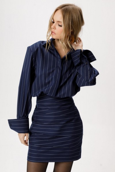 Детали: платье полуприлегающего силуэта, отрезное по талии с напуском, нижняя часть переда с ассиметричными складками, нижняя часть спинки с талиевыми вытачками, верхняя часть платья со складками на талии, рубашечный воротник, застёжка на потайную планку с пуговицами, потайная молния в боковом шве, рубашечный покрой рукава с расширенным плечом, широкие манжеты. Юбка платья на подкладке