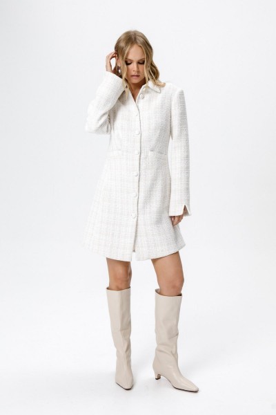 Детали: полуприлегающий силуэт, перед с функциональными карманами, однобортная застежка на петли и пуговицы, фигурный низ, рукава втачные с разрезами по низу, платье на подкладке.