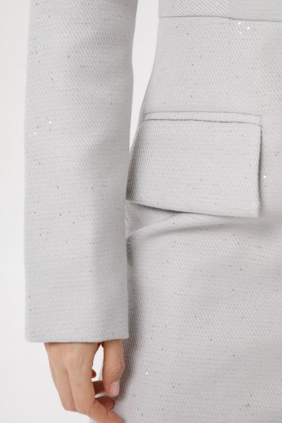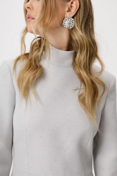 Детали: полуприлегающий силуэт, отрезное по линии талии, перед с талиевыми вытачками, функциональные карманы с фигурными клапанами, спинка со средним швом и талиевыми вытачками, втачные одношовные рукава, воротник-стойка, застёжка на потайную молнию в среднем шве спинки, платье на подкладке.