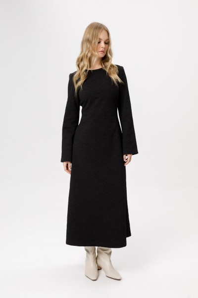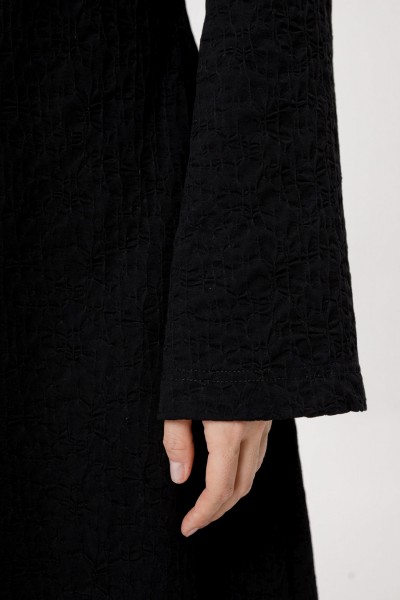 Детали: полуприлегающий силуэт, нагрудные вытачки, талиевые вытачки по спинке, втачные удлиненные рукава.