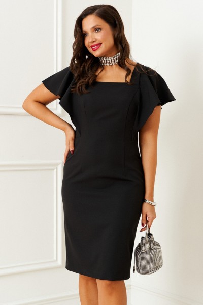 Платье прилегающего силуэта средней длины выполнено из костюмного смесового полотна.