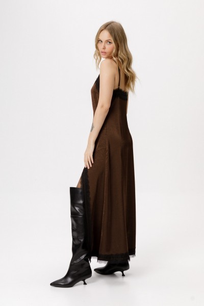 Детали: полуприлегающий силуэт, нагрудные вытачки, фигурный вырез по переду, разрез по ноге с кружевной отделкой, потайная молния в боковом шве, регулируемые бретели.