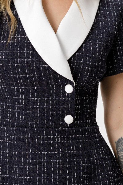 Детали: платье полуприлегающего силуэта, перед с рельефами и имитацией запаха с застежкой на две петли и пуговицы, спинка со средним швом и талиевыми вытачками, рукава втачные с запахом и бантовыми складками, шалевый контрастный воротник, платье застёгивается на потайную молнию в левом боковом шве, платье на подкладке.