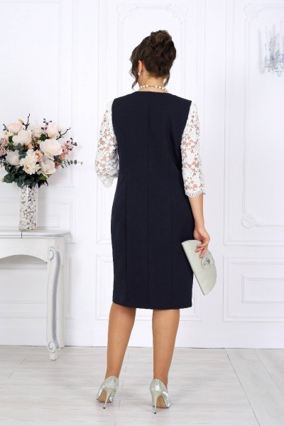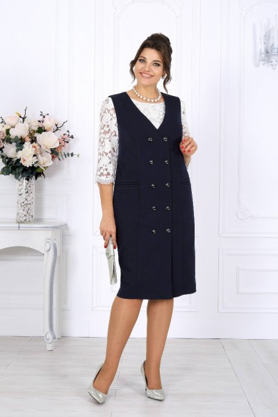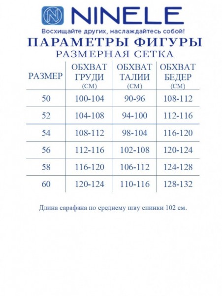 Сарафан полуприлегающего силуэта, выполнен из костюмной ткани, с двубортной застежкой на 9 петель, 10 декоративных и 4 потайных пуговиц, на трикотажной подкладке. Длина сарафана по среднему шву спинки 102 см. Перед с рельефными швами, проходящими через центр груди, идущими от пройм до низа, с прорезными карманами в рамку от рельефных швов. Спинка с рельефными швами, идущими от пройм до низа, со средним швом. Проймы переда и спинки обтачные. Горловина переда V-образной формы, углубленная.