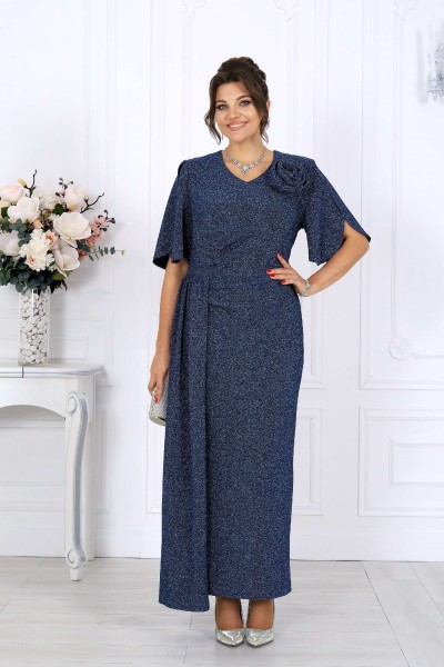 Платье женское полуприлегающего силуэта, выполнено из трикотажного полотна с фактурной лицевой стороной «люрекс». Модель на трикотажной подкладке, с плечевыми накладками. В левом боковом шве обработана застежка на потайную тесьму-«молнию» (35 см). Перед платья с горизонтальным подрезом по линии талии и отлетной деталью в шве подреза. В правой части переда обработан рельеф с разрезом в нижней части. Вдоль рельефного шва заложены односторонние складки, направленные к центру переда. Спинка с талиевыми вытачками. Горловина спинки округлая, по переду V-образная, углубленная. Рукав короткий, втачной, формы «крылышко на запах», со скругленными краями. Платье дополнено съемным «цветком» из основного полотна. Длина платья - 136 см; длина рукава - 31 см.