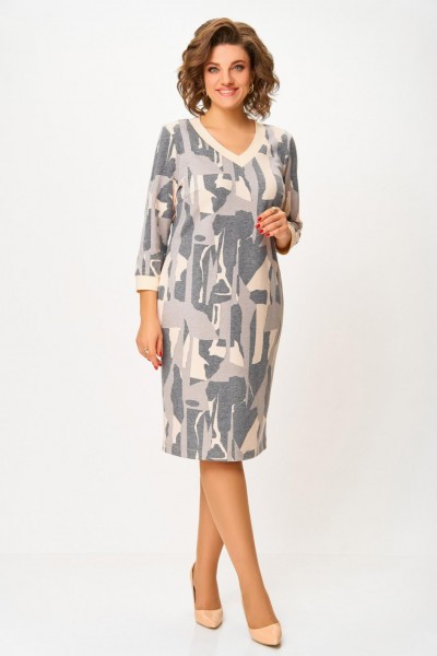 Платье из эластичного трикотажного полотна полуприлегающего силуэта. По переду обработаны нагрудные вытачки. Спинка цельнокроеная. Рукав втачной одношовный длиной 4/5 с манжетой из декоративного трикотажного довяза. В боковых швах обработаны карманы. Горловина V-оборазной формы, обработана декоративным трикотажным довязом.