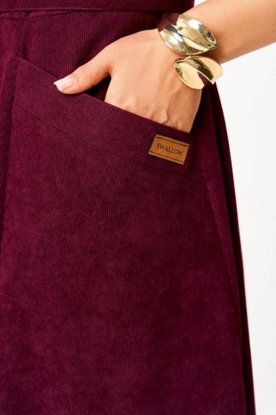 Платье из мягкой ткани вельвет, отрезное по линии талии с полуприлегающим лифом и юбкой А-силуэта, с центральной застёжкой на петли и декоративные пуговицы.