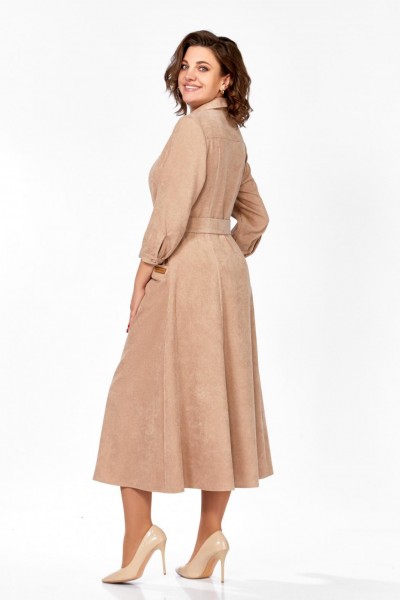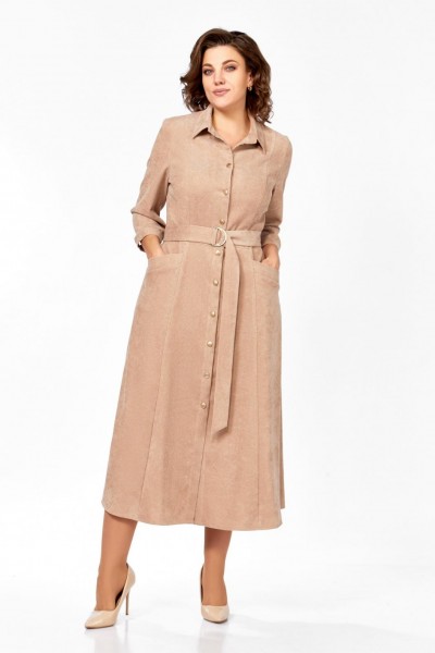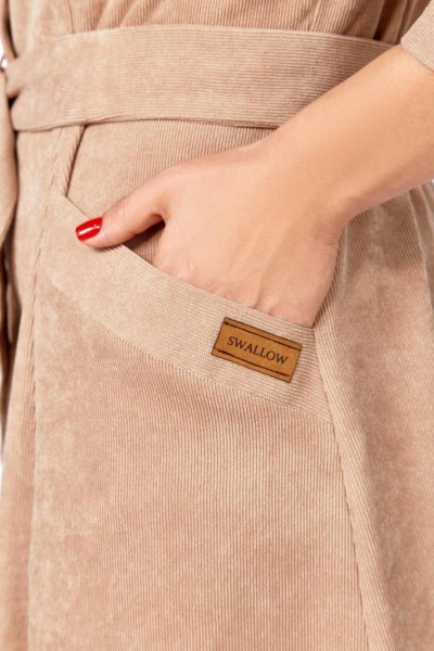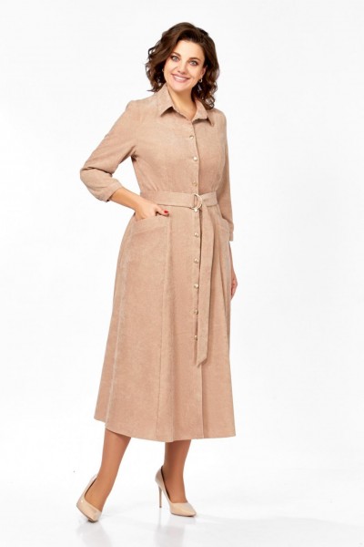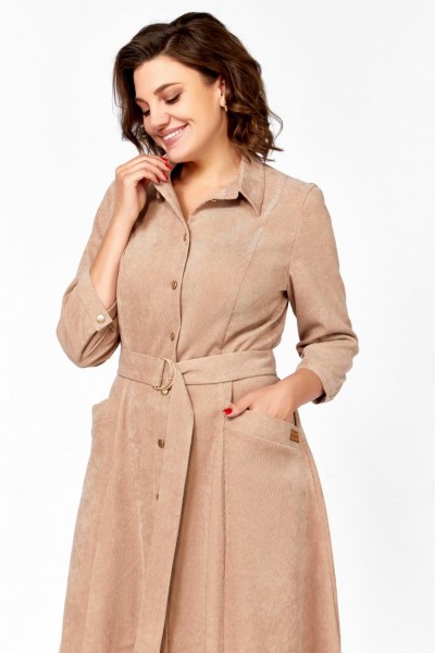 Платье из мягкой ткани вельвет, отрезное по линии талии с полуприлегающим лифом и юбкой А-силуэта, с центральной застёжкой на петли и декоративные пуговицы.