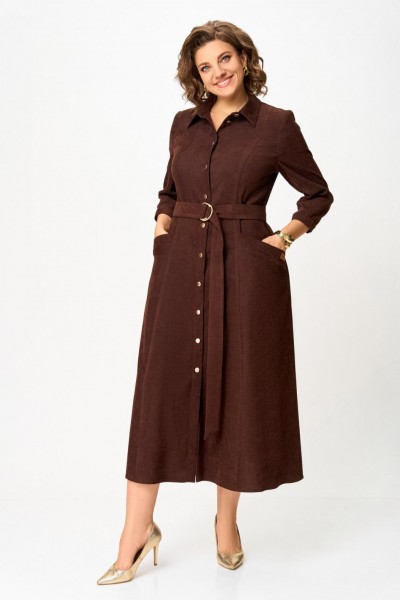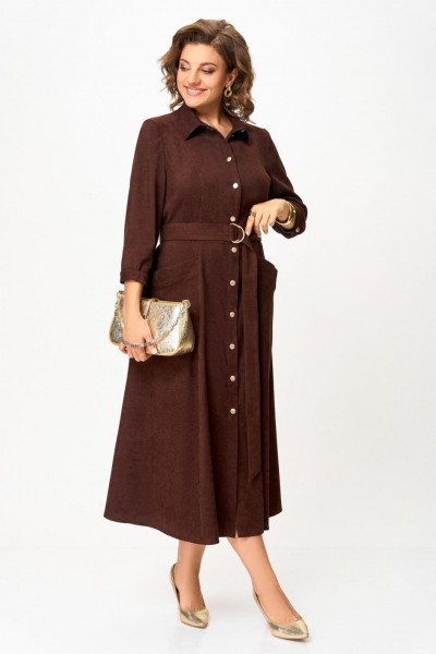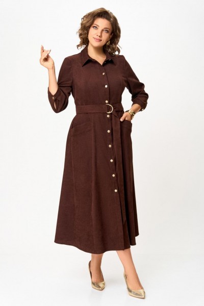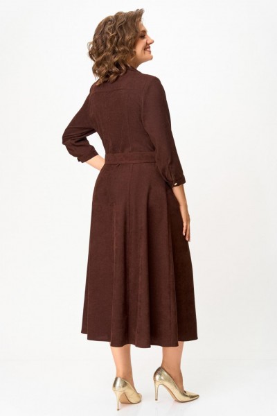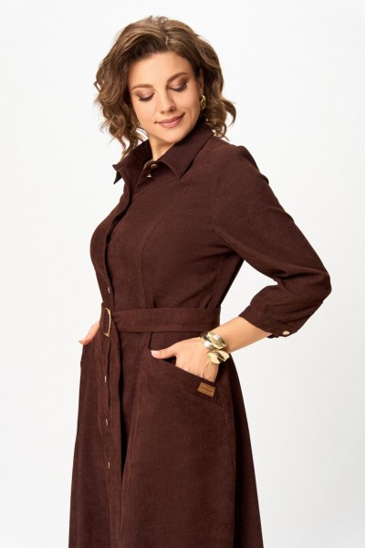 Платье из мягкой ткани вельвет, отрезное по линии талии с полуприлегающим лифом и юбкой А-силуэта, с центральной застёжкой на петли и декоративные пуговицы.
