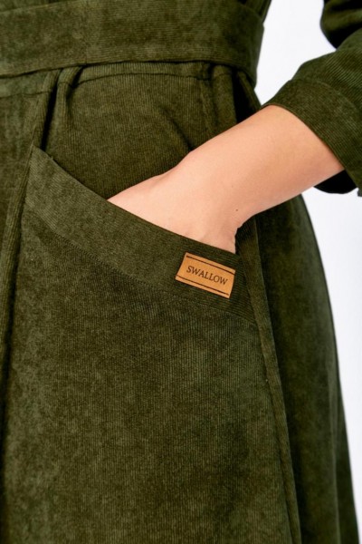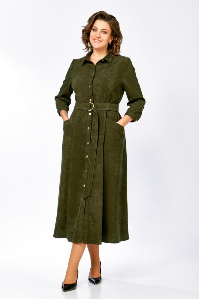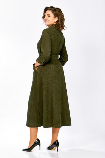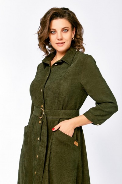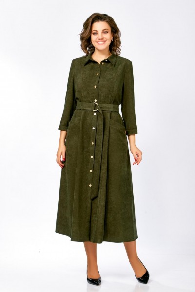 Платье из мягкой ткани вельвет, отрезное по линии талии с полуприлегающим лифом и юбкой А-силуэта, с центральной застёжкой на петли и декоративные пуговицы.