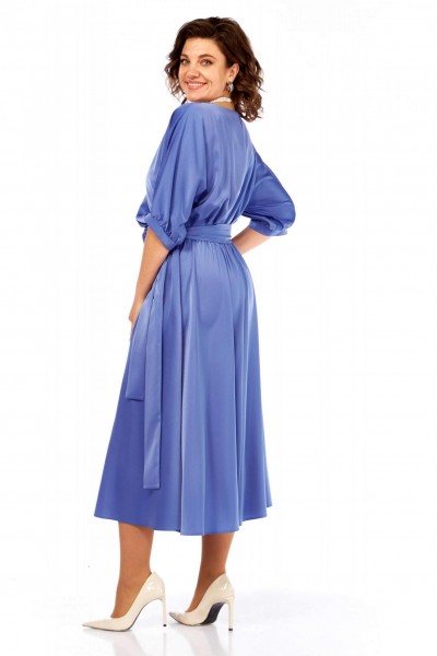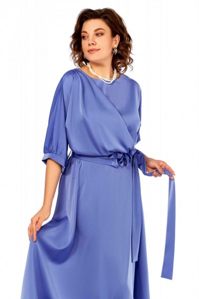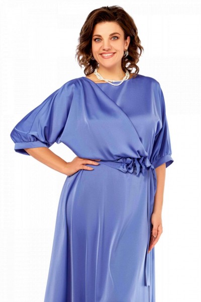 Нарядное платье из струящейся ткани, отрезное по линии талии. Верх летучая мышь, по низу рукава сборка и притачная манжета. Вырез горловины округлой формы. По переду ассиметричная деталь от плеча до линии подреза. По линии подреза резинка. Нижняя часть платья клеш. К платью прилагается интересный пояс, украшенный стразами.