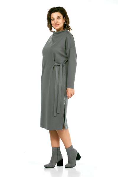 Платье женское, прямого силуэтв со спущенным длинным рукавом. Цельнокроенный воротник-стойка. Слевой стороны в области талии слева декор, в виде ниспадающего пояса. Карманы в боковых швах. Молния в левом боковом шве внизу функциональная молния, которая при растегивании превращается в разрез.