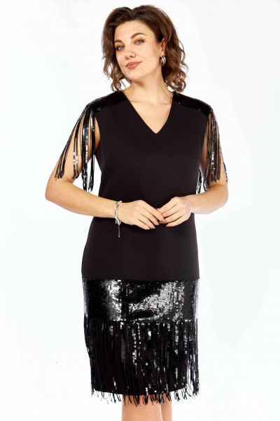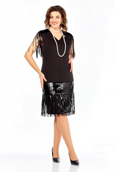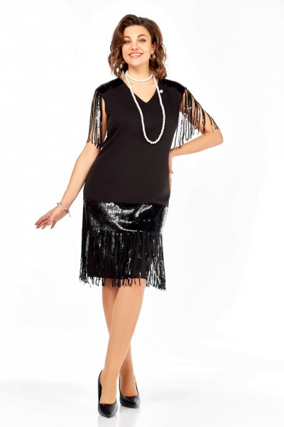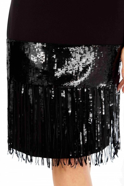 Нарядное платье полуприлегающего силуэта, с дизайнерской отделкой из ткани в паетки. Вырез горловины V-образной формы, отрезные кокетки из отделочной ткани, с бахрамой, имитирующей рукав. Подрез ниже линии бедер из отделочной ткани. Талиевые вытачки. Средний шов по спинке с потайной молнией и разрезом.