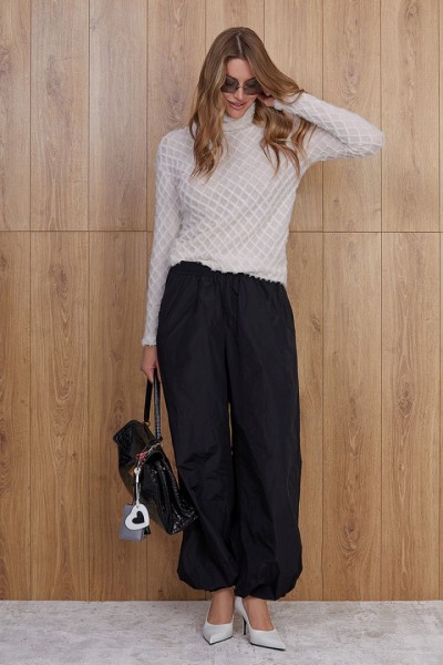 Джемпер прямого силуэта, немного заужен книзу, выполнен из мягкого и комфортного трикотажного полотна. Ажурная ткань с бархатистой поверхностью и очень приятная к телу. Перед и спинка изделия прямые. Чуть спущенная линия плеча. Втачной длинный рукав. Горловина высокая двойная стойка.