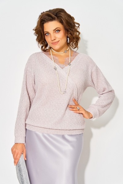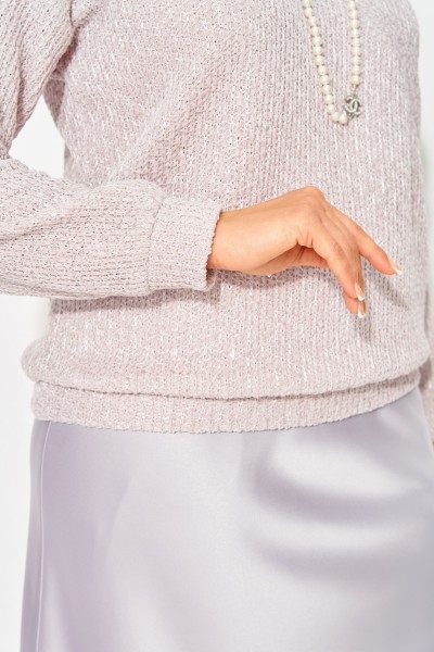Вязанный жемчужно-лиловый джемпер с ажуром по вороту - это идеальный вариант для создания стильного и привлекательного романтического образа! Мягкий и нежный материал этого джемпера делает его очень приятным на ощупь, теплым и уютным, а легкое мерцание придает свою изюминку. Горловина v-образной формы приковывает взгляды к линии декольте. Рукав длинный, на спущенной линии плеча. Низ рукава, а также низ изделия оформлен мягкой трикотажной манжетой. Особенно актуальна данная кофточка на осенний и зимний период, за счет качественного состава, не пропускает холод обеспечивает тепло и комфорт! Длина по спинке – 65 см, рукав – 62 см.