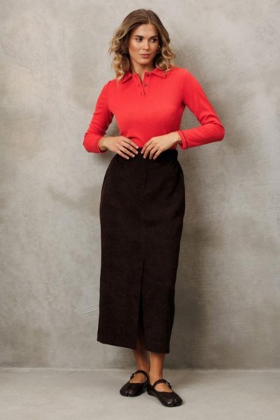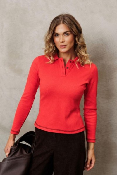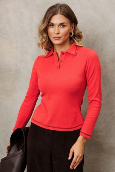Джемпер приталеного силуэта с воротником поло из трикотажного полотна. Рукав втачной одношовный.