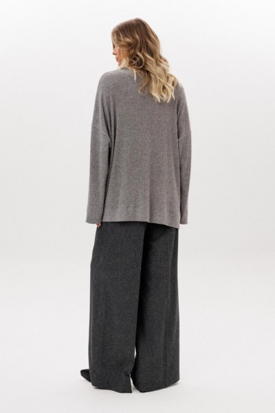 Джемпер выполнен из трикотажного полотна в рубчик. Джемпер прямого силуэта , покроя "oversize" длиной ниже линии бедер. Перед и спинка цельные. Горловина округлой формы, обработана широкой бейкой. Плечевой шов удлинен. Рукав рубашечного покроя, одношовный. В боковых швах разрезы.