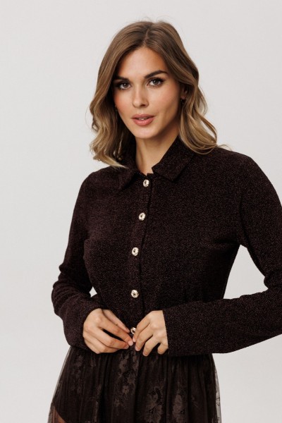 Джемпер выполнен из трикотажного полотна с блеском. Джемпер полуприлегающего силуэта, длиной выше линии бедер. Воротник стояче-отложной. Плечевой шов удлинен. Рукав втачного покроя, одношовный. Застежка по планке на петли и декоративные пуговицы.