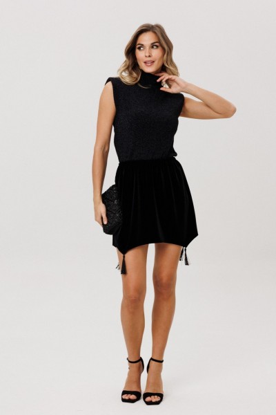 Джемпер выполнен из трикотажа с блеском. Джемпер приталенного силуэта, длиной выше линии бедер. В среднем шве застежка на потайную молнию, Воротник-стойка. Плечевой шов удлинен. Джемпер на плечевых накладках