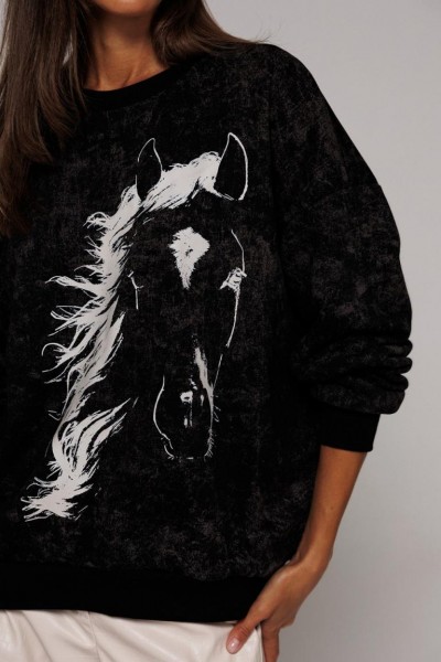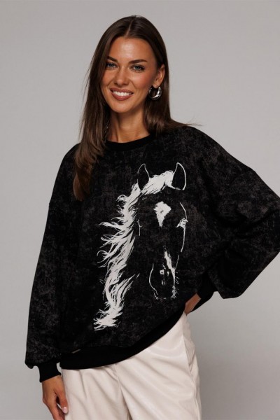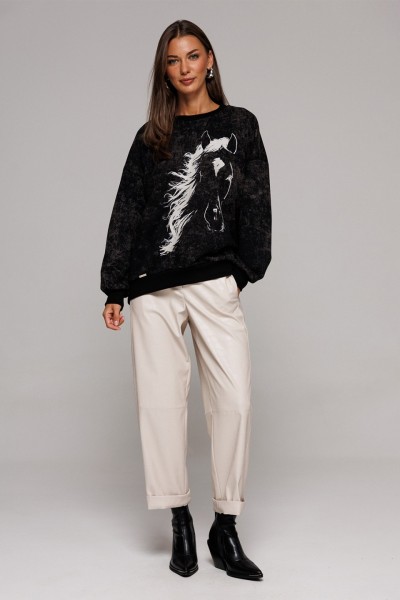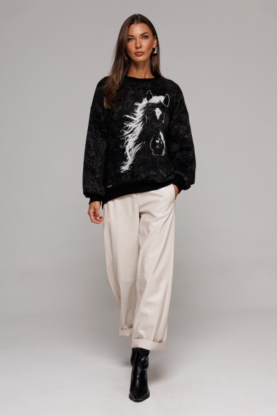 Джемпер из трикотажного полотна свободного силуэта, слегка заужен к низу, с втачным рукавом и спущенной линией плеча, с манжетой из отделочной ткани по низу рукава. По переду печать "HORSE" и нашивка с гравировкой "BUTER", низ фигурный. Спинка длиннее переда. По горловине и низу изделия притачная планка из довяза.