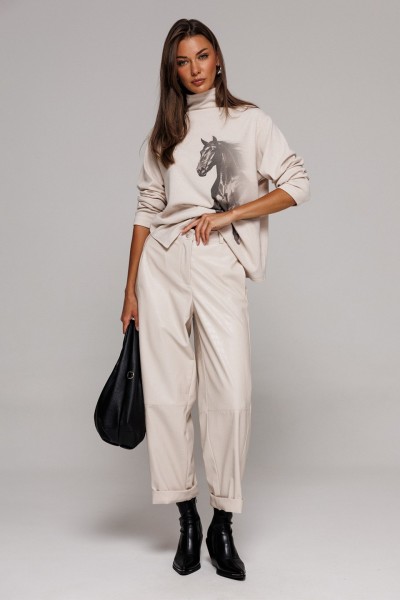 Джемпер из трикотажного полотна с велюровым эффектом прямого силуэта со спущенной линией плеча. Рукав втачной. По переду печать "Лошадь" и нашивка с гравировкой "BUTER". Низ джемпера по переду фигурный ассиметричный. Внизу по правому боковому шву обработан разрез. Воротник-стойка цельнокроеный.