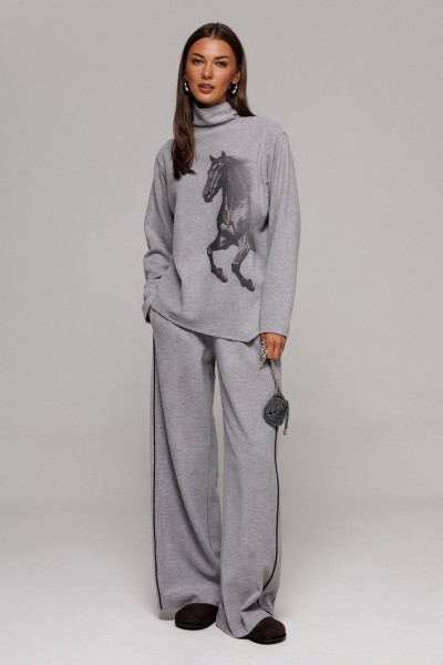Джемпер из трикотажного полотна с велюровым эффектом прямого силуэта со спущенной линией плеча. Рукав втачной. По переду печать "Лошадь" и нашивка с гравировкой "BUTER". Низ джемпера по переду фигурный ассиметричный. Внизу по правому боковому шву обработан разрез. Воротник-стойка цельнокроеный.
