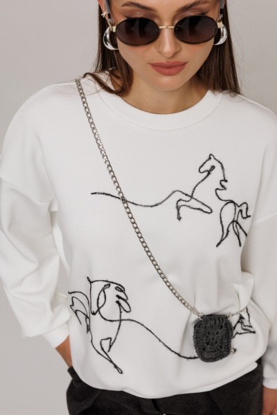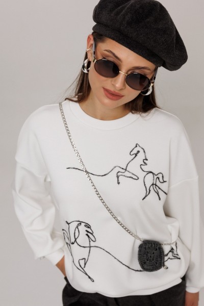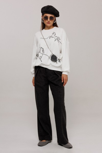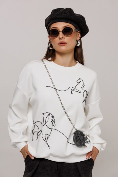 Этот стильный белый джемпер из технологичного трикотажного полотна с эффектом peach подчеркнет ваш утонченный вкус. Прямой силуэт, втачной рукав с манжетами и спущенная линия плеч создают непринужденный образ. Художественная деталь - декоративный шнур "Кони", вышитый на передней части, добавляет изысканности. По горловине и нижнему краю изделия притачная планка из отделочной ткани завершает дизайн, делая этот джемпер идеальным выбором для стильных повседневных ансамблей.