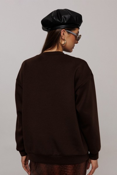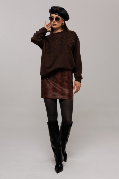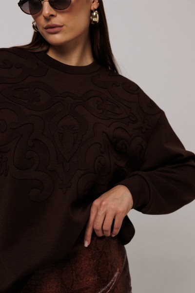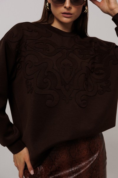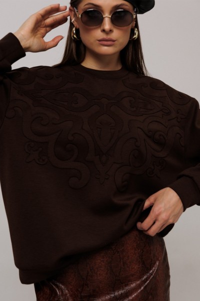 Джемпер из технологичного трикотажного полотна с эффектом peach. Прямого силуэта с втачным рукавом и спущенной линией плеча, с манжетой из основной ткани по низу рукава. По переду вышивка "Орнамент". По горловине и низу изделия притачная планка из основной ткани.