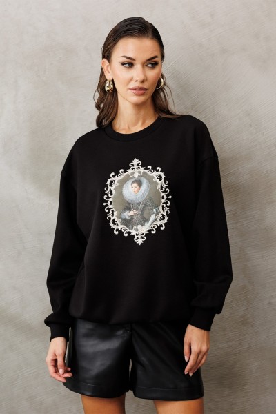 Джемпер из технологичного трикотажного полотна с эффектом peach. Прямого силуэта с втачным рукавом и спущенной линией плеча, с манжетой из отделочной ткани по низу рукава. По переду печать с вышивкой "Queen". По горловине и низу изделия притачная планка из отделочной ткани.