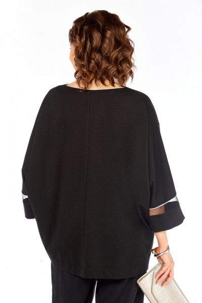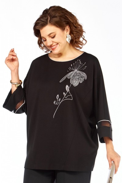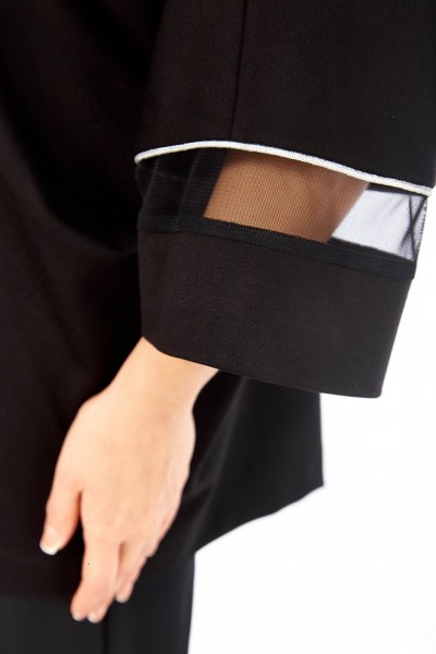Джемпер женский, нарядный, свободного кроя. Перед разрезной, с дизайнерской вышивкой — аппликацией. Горловина круглой формы с кантом. Рукава цельнокроеные со вставками из сетки с кантом.