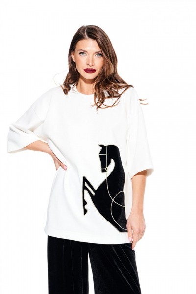 Джемпер из трикотажного полотна, прямого силуэта, свободный, с круглым вырезом горловины. Перед и спинка цельные. По переду выполнена вышивка-аппликация из бархата "Лошадь".
