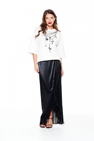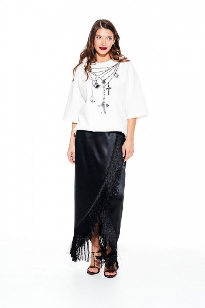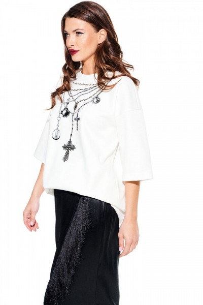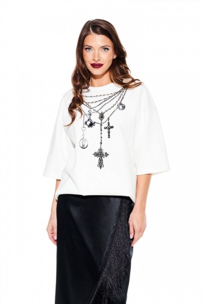 Джемпер из трикотажного полотна, свободного объема, прямого силуэта, с круглым вырезом горловины. Перед и спинка цельные. По переду выполнена печать "Цепи".