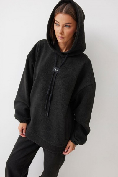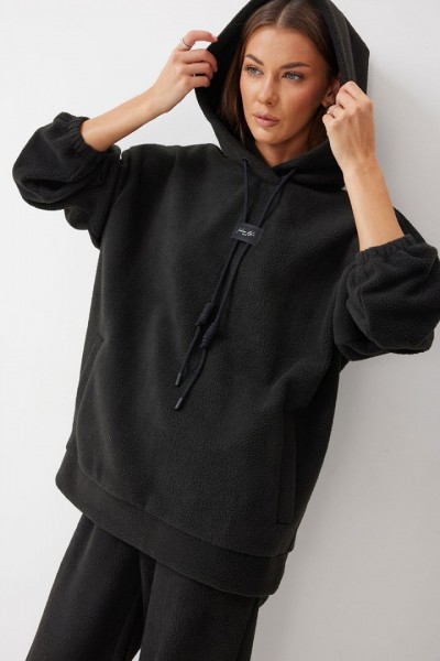Джемпер прямого силуэта из комфортного трикотажного полотна. Горловина обработана капюшоном. Рукав со спущенной линией плеча, по низу на резинке. По низу джемпера притачной пояс. По переду декоративная нашивка и шнур.