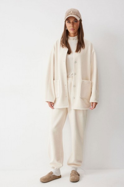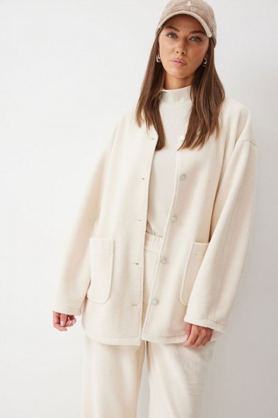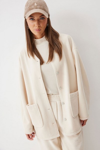 Жакет прямого силуэта с фигурным низом из трикотажного полотна. Горловина округлая, по центру застежка на кнопки. Рукав со спущенной линией плеча. По переду накладные карманы. Жакет без подкладки.