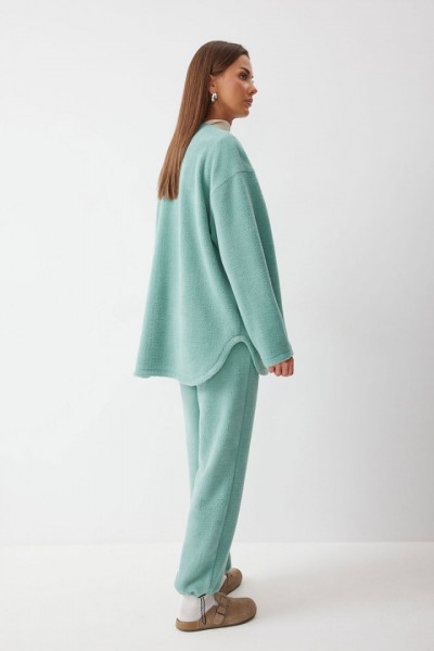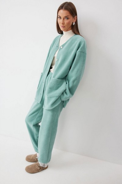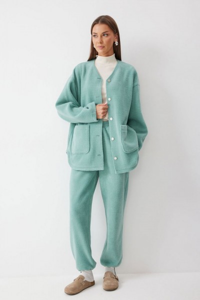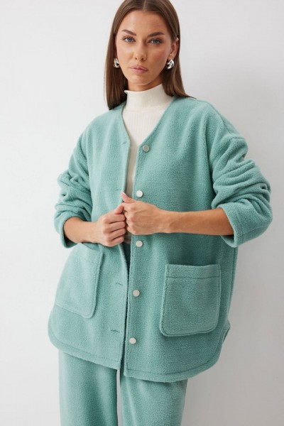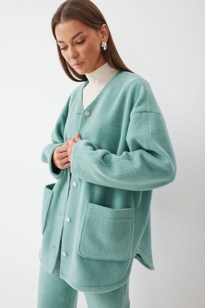 Жакет прямого силуэта с фигурным низом из трикотажного полотна. Горловина округлая, по центру застежка на кнопки. Рукав со спущенной линией плеча. По переду накладные карманы. Жакет без подкладки.