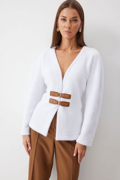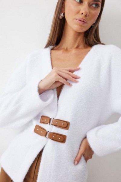 Джемпер полуприлегающего силуэта из трикотажного пушистого полотна. V-образная горловина, рукав реглан. По переду джемпера расположены пряжки. На спинке расположены вытачки, для придания силуэта.