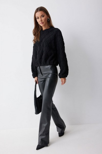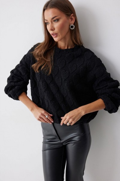 Укороченный джемпер прямого силуэта из трикотажного полотна. Горловина округлая. Рукав со спущенной линией плеча, по низу резинка. По низу джемпера резинка.