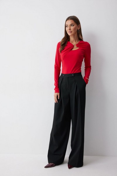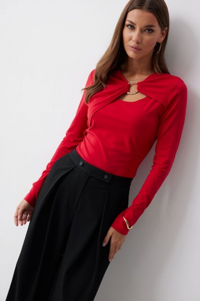 Джемпер прилегающего силуэта из трикотажного полотна. Горловина с фигурным вырезом декоративными складками и фурнитурой. Рукав втачной удлиненный . Обращаем ваше внимание, что фурнитура может отличаться от фото.
