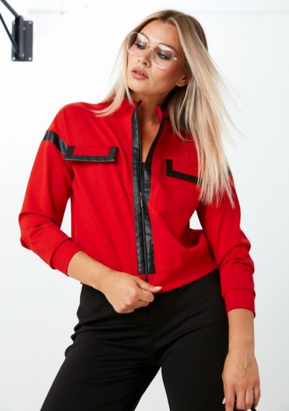 Укороченный джемпер свободного силуэта с застёжкой на молнию. Воротник - стойка. По переду выполнена имитация карманов с клапанами с окантовкой из экокожи. На рукавах и вдоль молнии также вставка из экокожи.