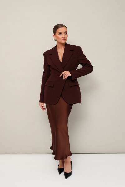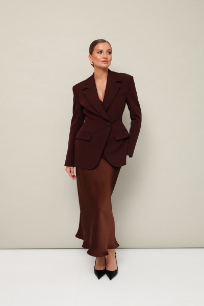 Элегантный брючный костюм шоколадного оттенка. Комплект включает в себя хорошо сидящий блейзер с классическими лацканами и функциональными карманами с клапанами. В тандем к нему представлены прямые брюки с аккуратными стрелками, дополняющие основной силуэт. Костюм выполнен из высококачественного материала, идеально подходящего как для офиса, так и для важного мероприятия. Для полного образа предлагаем удлинённый миди юбка сложного кроя «по косой» в тон костюму. Широкий пояс на обтачке обеспечивает идеальную посадку по фигуре, а потайная молния в боковом шве чисто дополняет общую гладкость фасона, делая акцент на изысканной простоте и стиле. Этот элемент одежды добавит изысканности и разнообразия, позволяя создать множество вариантов для различных событий.