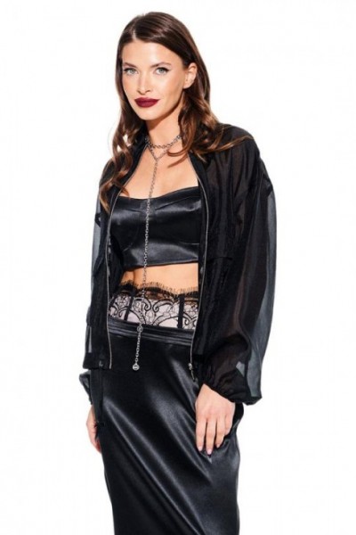 Юбка из струящейся ткани с блеском, прямого силуэта, с застежкой на потайную молнию в среднем шве спинки. Пояс из контрастной ткани, отрезной, оформлен тесьмой из кружева с имитацией корсета, на обтачке. По верхнему срезу переднего полотнища заложены три горизонтальные складки. Заднее полотнище с талиевыми вытачками и средним швом, заканчивающимся разрезом. Нижний срез обработан тесьмой из кружева.