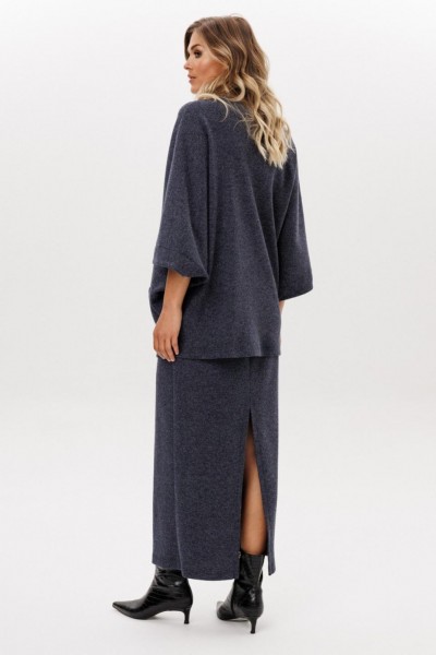 Юбка выполнена из трикотажного полотна. Юбка прямого силуэта, длиной миди, на цельнокроенном поясе с эластичной тесьмой. Сзади разрез в среднем шве.