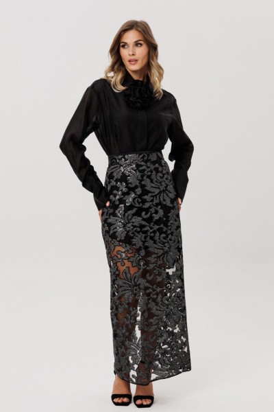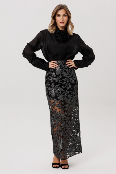 Юбка выполнена из сетки с вышивкой с пайетками. Юбка прямого силуэта, длиной миди. Юбка на притачном поясе, застегивающимя на петлю и пуговицу и на потайную молнию сзади в среднем шве. Юбка без подкладки.