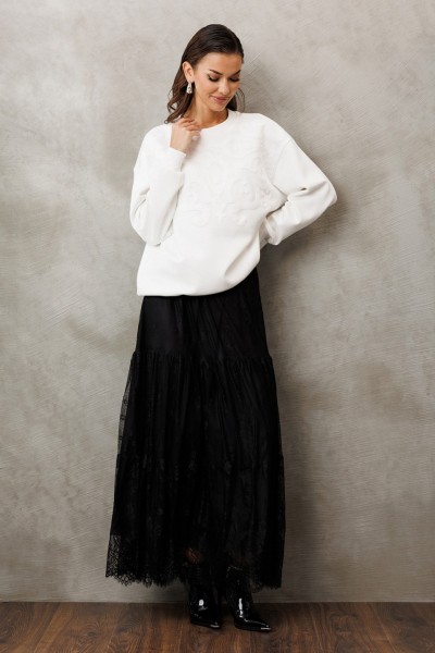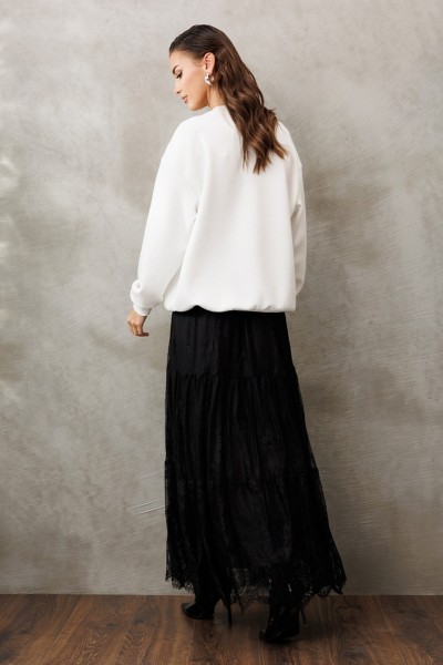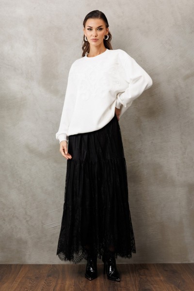 Юбка из кружева длинная на притачном поясе из кружева со вставленной в него резинкой. Юбка с 2-мя притачными слегка присборенными воланами. Юбка на подкладке.