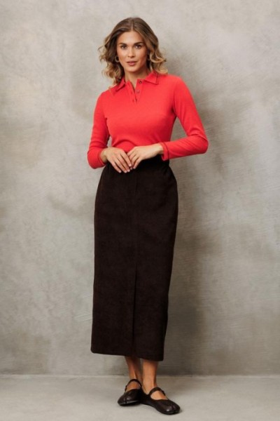 Юбка прямого силуэта выполненная из мягкой вельветовой ткани. Передняя честь юбки с вытачками, со средним швом и застежкой гульфиком на молнии и щлицей спереди. Задняя часть юбки с вытачками. Юбка на притачном поясе с затежкой на петлю и пуговицу спереди и резинками по бокам. Юбка на подкладке.