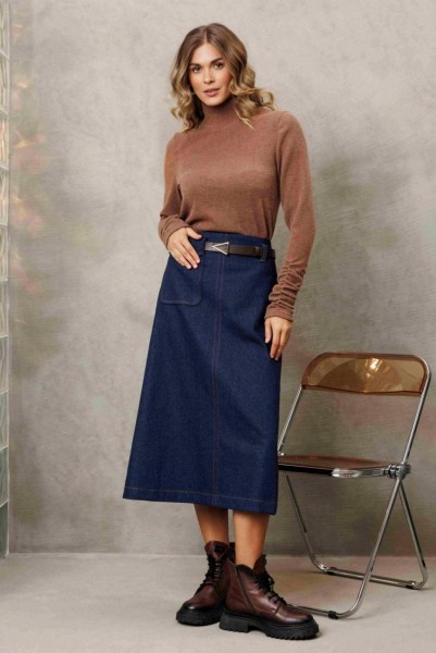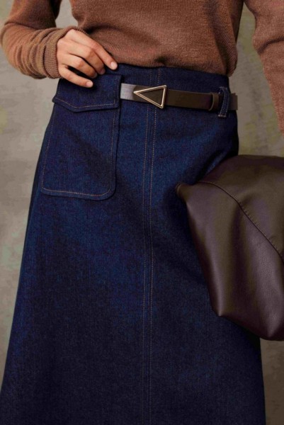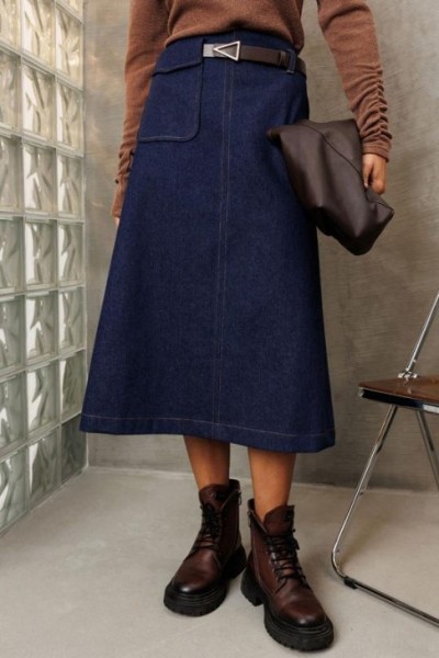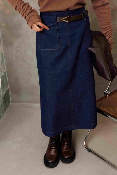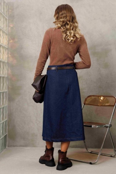 Юбка А-образного силуэта из плотного джинса. Передняя часть юбки со средним швом. С правой стороны вверху настрочен карман с клапаном- шлевкой. Задняя часть юбки со средним швом и вытачками. Сверху в среднем шве обработана потайная молния. Вдоль линии пояса настрочены шлевки. Пояс цельнокроеный на обтачке. Юбка на подкладке. Вдоль среднего шва по переду и по периметру кармана проложена декоративная строчка. К юбке прилагается сьемный ремень. Фурнитура может быть изменена с охранением художественного замысла.