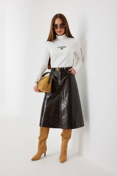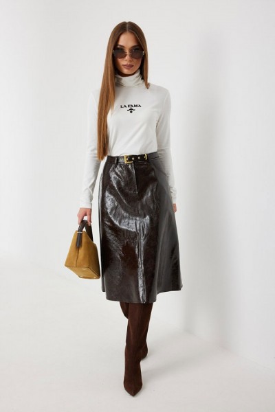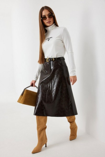 Юбка женская из трендовой фактурной экокожи на подкладке, длиной чуть ниже колена, пояс